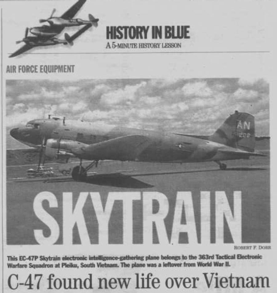 The following article on the C-47 SKYTRAIN appeared on page 24 in the Air Force Times dated 8 January 2001. Featured in the article is a picture of an EC-47P taken at Pleiku, South Vietnam. The article was written by Robert F. Dorr, as a special to the Times: