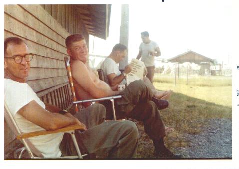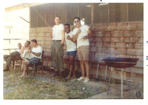 This picture shows some of the guys at Det 2 getting ready for a Barbecue, which is something we did as often as possible "if and when" we could scrounge some steak from the Marines. Shown in this picture are (left to right): MSgt Ed Owens, NCOIC Security Police TSgt Newman(I think), NCOIC Personnel MSgt Cid Allen, Det 2, 6994/DOA TSgt Sol Molotsky, First Sergeant and Backend Crew Member. Sol Molotsky was not only a good First Sergeant, but was also a "good cook." |