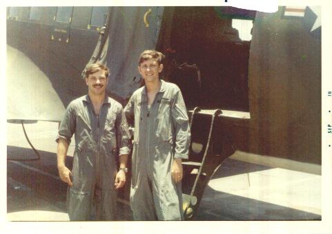 This picture was taken during preflight. I can't remember what, but something was wrong with the aircraft, so we were waiting around while 362 TEWS people fixed it. Since it was "warm/hot" on the flight line at DaNang, the A/C gave us permission to "hang around" the outside of the aircraft. This picture was taken September 1970. I hate to admit it, but I not only cannot remember what was wrong with the aircraft, but the two guys here are Phil Pratt on the right and Charlie Martin on the left. |