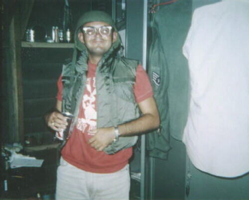 1968/TSN Don Edgcomb wearing my flack jacket and 'tin pot' in my 'space' in the barracks. The red sweat shirt has