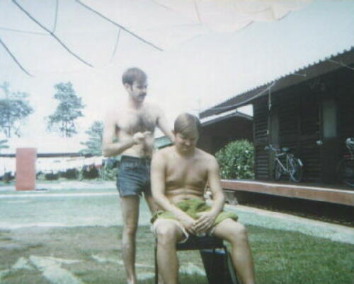 1972/NKP Several members of Det. 3, 6994th triming their hair.