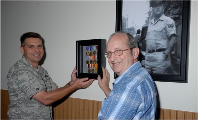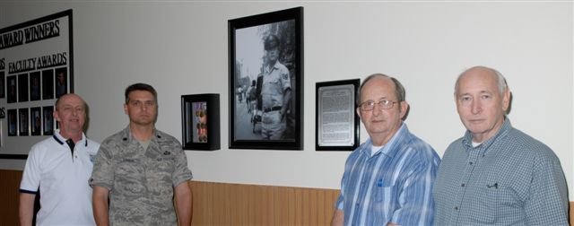 Lt. Col. Erick Lawson, the 316 TRS commander, and retired Chief Master Sgt. Ed Bendinelli placed a shadow box containing medals belonging to Tech. Sgt. Fred Sebers' on a wall inside Sebers Hall to complete the inside memorial to Sergeant Sebers, who died in Vietnam more than 40 years ago.