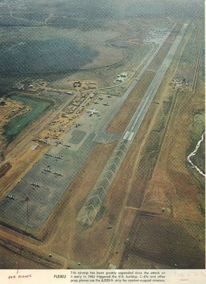 ![]() -PLEIKU- This airstrip has been greatly expanded since the attack on it early in 1965, triggered the U.S. buildup. C-47 and other propeller aircraft use the 6,000 foot strip for combat support missions, May 1967