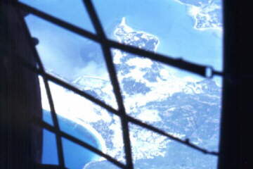 Left - Airborne southbound "Feet Wet" (offshore). - - Right Coastal sandbar as viewed from the cargo door.