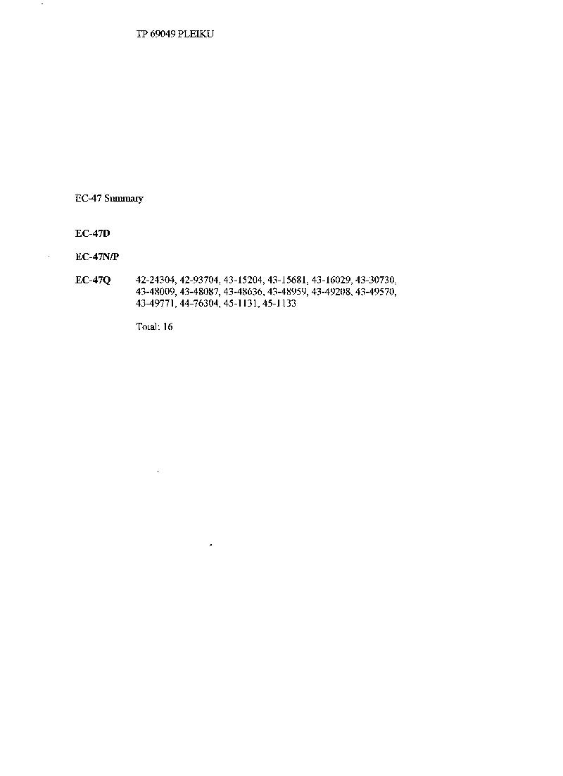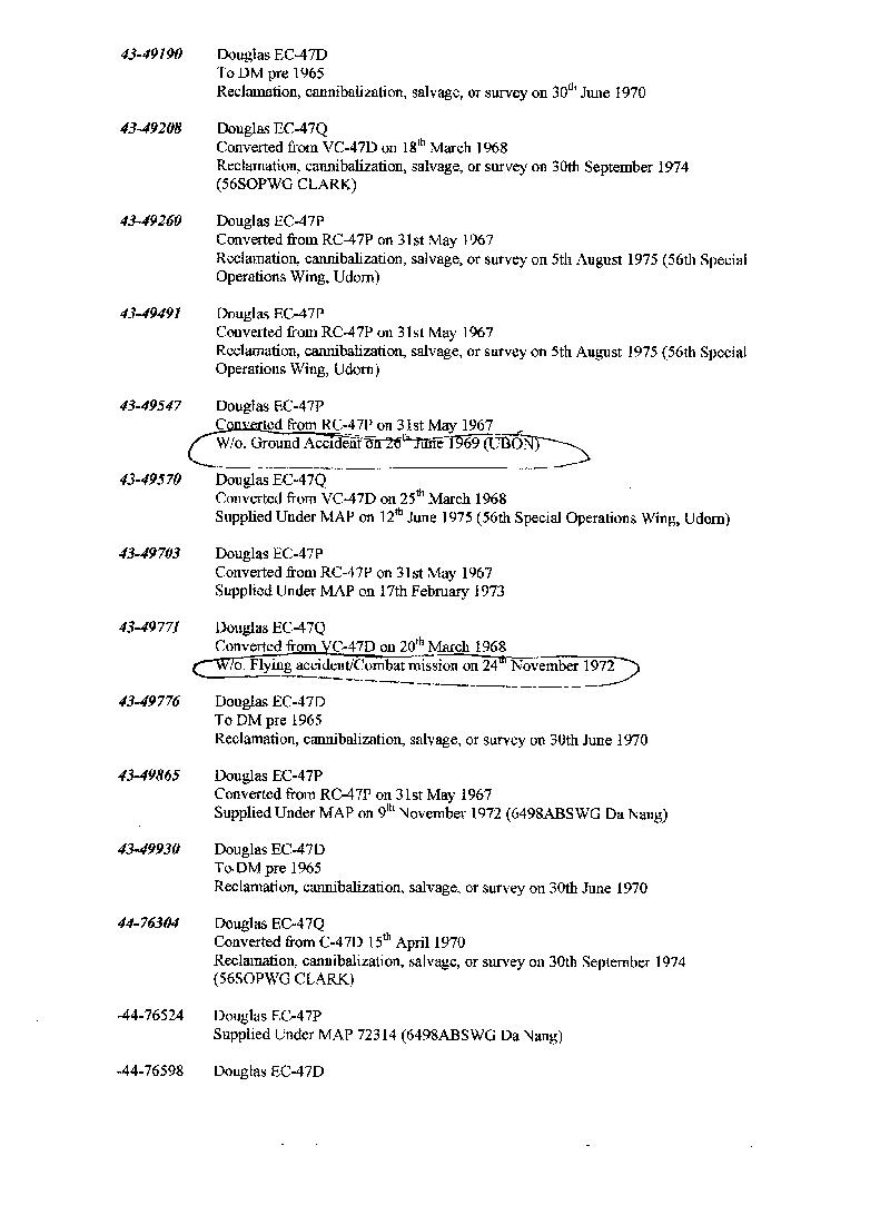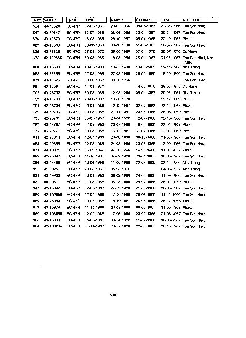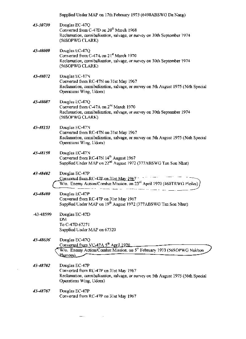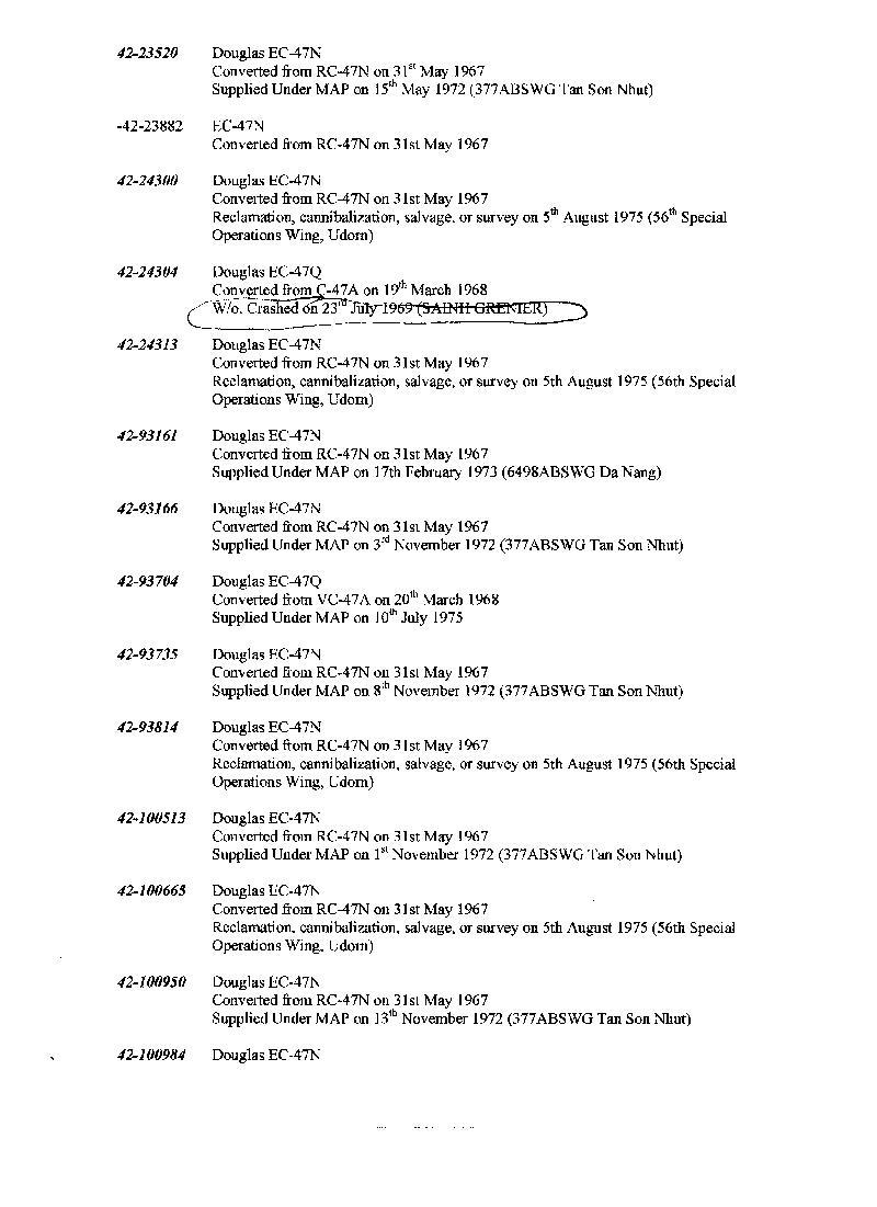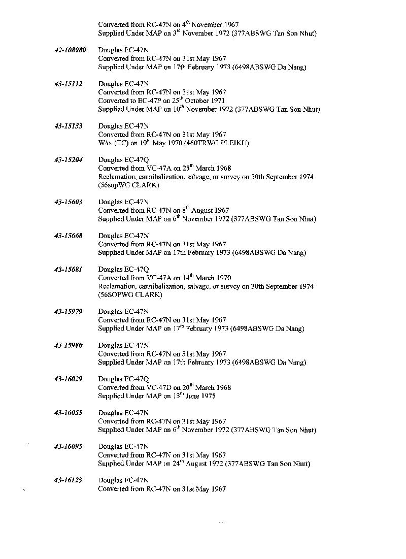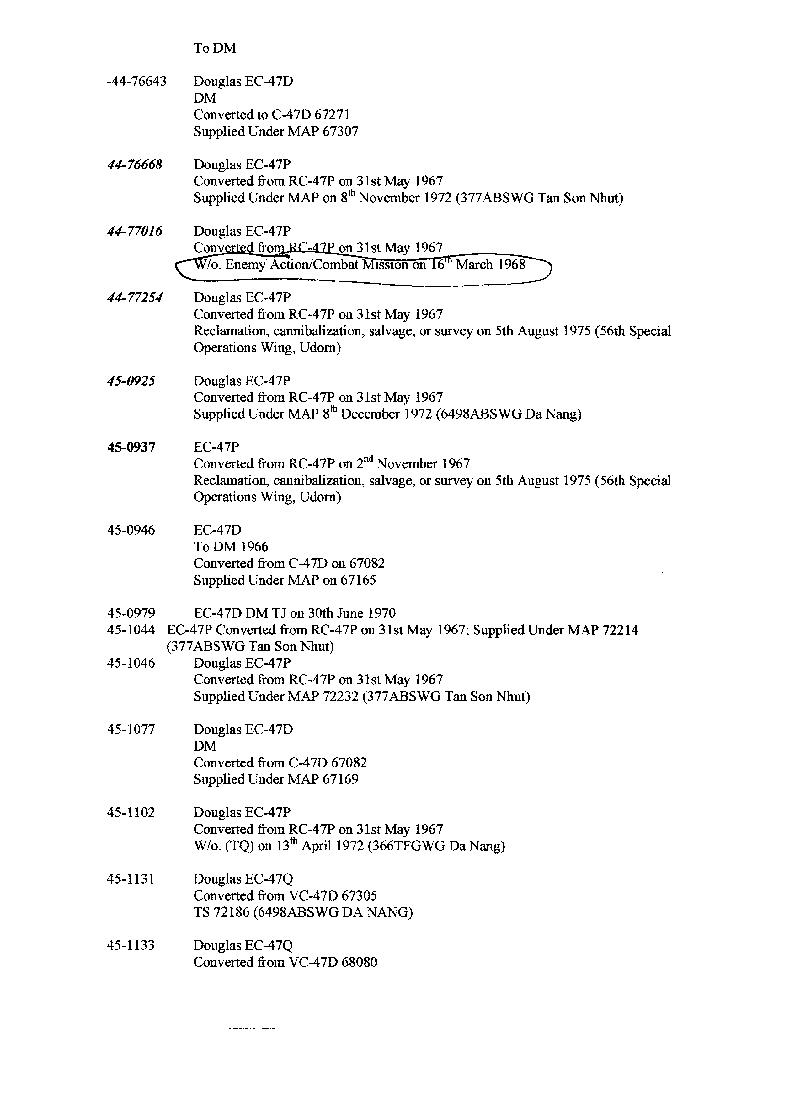 seems to not understand when you speak of say Balls Nine they may in fact be thinking of the other tail number 009. Those that I noted are "009" aka Balls Nine. "009" EC-47 Q was Serial Number 43-48009 EC-47 P was Serial Number 43-49009 "133" EC-47 N was Serial Number 43-15133 EC-47 Q was Serial Number 43-1133 "304" EC-47 Q was Serial Number 42-24304 2nd EC-47 Q was Serial Number 44-76304 "668" EC-47 N was Serial Number 15668 EC-47 P was Serial Number 76668 "980" EC-47 N was Serial Number 42-108980 2nd EC-47 N was Serial Number 43-15980 |