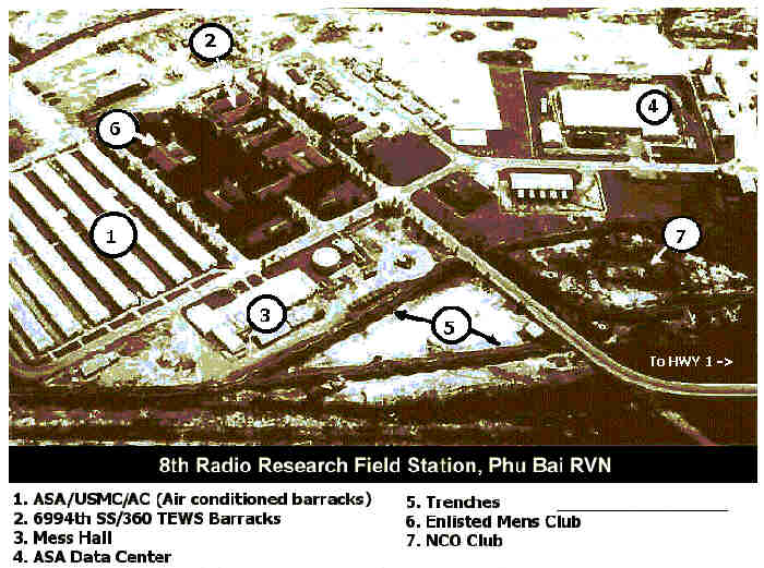 Photo at bottom of screenThis is the text to accompany the bit map of the Army compound at Phu Bai RVN and I hope answers some of the concerns that the flights out of Phu Bai get little attention. Obviously there were far more ARDF aircraft/crewmen and missions than the one or two daily missions/crews that flew out of Phu Bai. As always, feel free to alter, confirm or deny any of my observations. These are my few recollections - on this web site Darwin Bruce has documented the aircraft numbers, day-to day activities, etc. far better than I can remember. I was 20 years old when I arrived in country and had never flown on a military aircraft prior to my first mission for the 6994th so early on my concern was more to the job at hand rather the events around the missions. I arrived in country at TSN 6994th in early 10/66. I flew as a backender 292x1 out of TSN (ARDF) and Phu Bai (direct intercept). So, as far as I can remember I flew out of Phu Bai - October thru December 66 (first time) and then again from August/September 67 until October 67 (second time). The rest of the time was spent on flights out of TSN. Sometime during the middle of 10/66 I was "volunteered" to fly with the 292s out of Phu Bai. At that time I only remember one aircraft which flew daily - there was a AC/Pilot/Crew Chief/1 or 2 ground technicians (all 360 TEWS) plus 1 202 and 4/5 or 6 292's. Everyone flew daily, I think we had one extra 292 so that we could rotate a day off. Once on site at Phu Bai there was no return to TSN until the plane was rotated this could be six to eight weeks. I would imagine that one could spend a tour atTSN and not know there were 292s flying out of Phu Bai. Phu Bai was an interesting base. I believe it was 3rd Marine Headquarters and was said to be the largest helicopter base in the world. There was a detachment of ARVN and the Army 8th RRU. The Marines were billeted along and around the helicopter pad and the runway, the Army had some aircraft and what appeared to hangers off one end of the runway, the 8th RRU had a compound across on the other side of Highway One from the Marines. The aircraft was usually parked off the side of the runway next to Marine tents. The whole area was pretty sandy. I always got the impression the Marines did not particularity like the Air Force being there and as I remember we periodically had to find a new place to park the aircraft. (I have visited other web sites (Army ASA types) and they made the same observations regarding the Marine's attitude toward the Army at Phu Bai). To put it in plain terms I think the Marines dorked around with the AC on a regular basis concerning where or where not to park the aircraft. The officers were billeted in the Army's air-conditioned housing. These were mobile home like structures (#1 on the aerial view). These structures had a center hallway and rooms on both sides - every section had a washer/dryer, etc. (not bad for any base). As I remember these were the barracks for the Army ASA personnel and Marine security troops. The rest of the crew and maintenance personnel lived in a long hut which must have been some kind of warehouse at one time (#2 on the aerial view). If you had a day off - there was absolutely nothing to do - read a book, go to the Enlisted Mens/NCO club (if they were open) or sleep. Once everyone was back there was usually a card game going on. The Mess Hall was air-conditioned and the food (meat & vegetables were fresh). The Army would pack us a large box of sandwiches for each flight. I remember we were told not to bring any food back - maybe we wouldn't get any more sandwiches if the Army thought we were wasting food or no one wanted to waste time cleaning the aircraft on landing. To this end I remember being responsible for dumping the sandwiches on the return to base. I have not heard of any one being hit by a piece of ham or cheese from 10k feet - I will give a prize for anyone who returns any C-ration or K-ration ham and egg can to me - because I've thrown a gob of these out the aircraft. There were always 150mm rounds going off during the night - seems like they we going straight over our the barracks. Once in a while you would hear small arms fire at night. The Army compound was pretty secure - once it got dark no one got on or off the compound unless they were previously identified. I do remember a ground technician sleeping under the planeall night - more than once. Also there was a Army's Chaplin's "tour" of Hue one week end a month. I never got to go on the tour. There was a bounty on Phu Bai ASA personnel (10k local or USA?), I don't know the method of payment but I am pretty sure that the bounty was documented. The second time I was there things were quite different. The compound was usually on full alert, no lights after eight o'clock, clubs closed, etc. I know we had two aircraft - one morning flight (6:00am to 2:00pm?) and one afternoon (2:00pm to 8:00pm?), plus I remember the morning flight occasionally flying at night also. I think there was an attempt to be over target twelve to sixteen hours a day. I know that on my last mission - things appeared to be normal - however when we returned the flight line was full of helicopters from the 173rd and the 4th Infantry?. Remember that TET 68 as a couple of months away. From what I can determine Phu Bai was overrun during the TET Offensive - the SS personnel were moved to Nha Trang? - I don't know what happened to the ASA sight - but I understand it was re-opened within two months. The NCO Club was interesting. This is the only club I was ever in where there were officers (not in regular uniform), NCOs and enlisted men - all four branches of the service (Army/Marine/Air Force/Navy (Seabees)) all in one club. There was a rumor that we flew missions north of the DMZ thru 12/66. The Army flew some two/three men aircraft (RU6?) I called them Cessnas. The rumor is that the NVA shot one of these with a missile - ergo we never flew north of the DMZ a