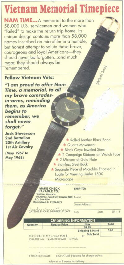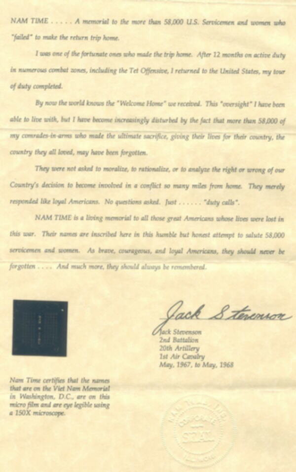 ![]() Certificate and contains a 1 inch microfilm with all 58,000 Names from the Vietnam Wall, readable with a 150X Microscope.